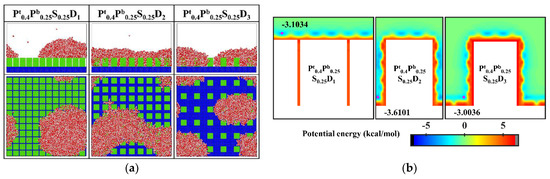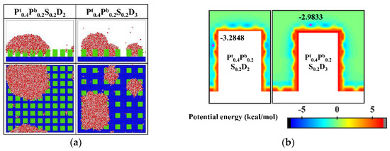 Since the condensation process on the aforementioned nanopillar surfaces with hydrophilic tops is different from the design prediction, the surface wettability distribution is further optimized. Specifically, 0.2 kcal mol−1, an interaction parameter indicating stronger hydrophobicity, is adopted to define the hydrophobic part of the nanopillar surface. Accordingly, two supplementary nanopillar surfaces with hydrophilic tops are modeled and noted as Pt0.4Pb0.2S0.2D2 and Pt0.4Pb0.2S0.2D3, respectively. The final morphology of the condensate and the equipotential curves of potential energy in these supplementary simulations are shown in Figure 13. Obviously, the condensed droplet is in the Cassie-Baxter state on the surface Pt0.4Pb0.2S0.2D2, while the water vapor still condenses into droplets in the Wenzel state on the surface Pt0.4Pb0.2S0.2D3. As shown in Figure 13b, the enhanced hydrophobicity of the hydrophobic part of the surface leads to a rise in potential energy at the bottom of the gap, causing water molecules to be preferentially deposited near the top of the nanopillar. When the interpillar spacing is D2, the higher potential energy at the bottom of the gap prevents the condensed droplets from sinking into the gap, so the droplets are in the Cassie-Baxter state. However, when the interpillar spacing increases to D3, the widened gap allows more water molecules to condense around the nanopillar, which makes it easier for the condensed droplets to penetrate into the structure, resulting in the formation of Wenzel droplets.
