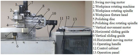 Four sets of magnetorheological polishing experiments were carried out on the fused silica glass workpiece surface to verify the material removal model’s certainty and validity. The workpiece parameters were a diameter of 27.5 mm and a thickness of 15 mm. Process parameters of the experiment were processing time, workpiece rotational frequency, processing gap and X-direction deflection. The values of the process variable are shown in Table 1. The laboratory designed the magnetorheological polishing device, and the magnetorheological polishing fluid was also configured by itself based on previous research. The magnetorheological finishing liquid used in the experiment was constituted of hydroxyl iron powder with a diameter of 2.5 μm, cerium oxide powder with a diameter of 10 μm, deionized water and a stabilizer. The main component of the stabilizer was sodium dodecyl sulfonate. The main components of the magnetorheological finishing liquid are shown in Table 2. The magnetorheological polishing device [21] is shown in Figure 1.