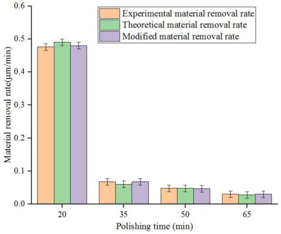 In the material removal bar chart in Figure 2, the orange, green and purple strips represent the average theoretical material removal, average experimental material removal and average modified material removal at each point of polishing time of 20 min, 35 min, 50 min and 65 min, respectively. The material removal rate of fused silica glass was inversely proportional to the polishing time. With the increase in that polishing time, as seen in Figure 2, the mean theoretical material removal, average experimental material removal and average corrected material removal all displayed a downward trend. The average material removal rate of the workpiece was maximum (0.476335 μm/min) when the polishing duration was 20 min, and the average MRR was the most petite (0.0278455 μm/min) when the polishing was 65 min. The mean MRR at 20–35 min decreased faster than at 35–65 min. From the overall trend, the corrected mean material removal was closer to the mean actual removal.