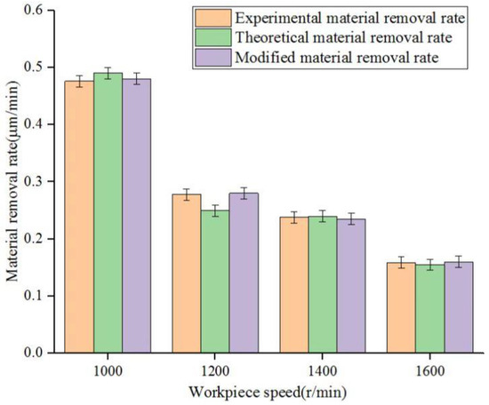 In the strip chart of material removal in Figure 3, the orange, green and purple strips represent the average theoretical material removal, average experimental material removal and average corrected material removal at each point when the workpiece rotational frequency is 1000 r/min, 1200 r/min, 1400 r/min and 1600 r/min, respectively. As the rotation speed of the workpiece increases, the interaction time between the corresponding micro-polished grinding heads and the surface of the fused silica glass workpiece decreases accordingly. As seen in Figure 3, the average theoretical material removal, average experimental material removal and average modified material removal all displayed a downward trend. As the rotation speed of the workpiece continued to increase beyond the limit, most of the flux linkage formed in the polished area broke and the abrasive particles clamped by the flux linkage reduced the material removal effect on the workpiece surface. Compared with the consequence of polishing time on the average MRR, the overall downward trend is slower, and the modified average material removal is closer to the average actual removal.