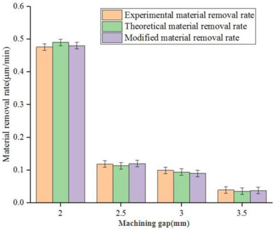 Three mean MRRs of polished workpiece surface at different machining gaps.