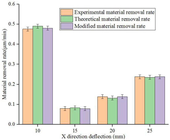 In the strip chart of material removal in Figure 5, the orange, green and purple strips represent the average theoretical material removal, average experimental material removal and average corrected material removal at each point when the X deflection is 10 mm, 15 mm, 20 mm and 25 mm, respectively. The average experimental material removal was 0.476335 μm/min, 0.2381668 μm/min, 0.0793889 μm/min and 0.1389306 μm/min, respectively. The average theoretical material removal, the average experimental and the average corrected material removal decreased first and then increased with an increase of X-direction deflection. As the X-direction deflection distance increases, the polishing path becomes longer. The frequency of cerium oxide (Ce2O) abrasive particles passing through the surface of fused silica glass workpiece decreases, resulting in the gradual decrease of material removal rate with an increase of X-direction deflection distance. At the same time, the workpiece deflection can compensate the machining area of the workpiece to a certain extent so that when the deflection amplitude increases, the machining uniformity gradually improves. It differs from the influence of polishing time, machining gap and workpiece rotational frequency on the mean MRR. However, the corrected average material removal trend is more accessible than the average actual removal.