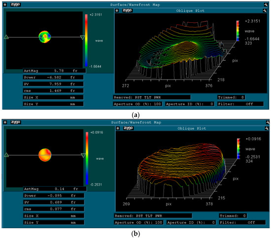 Surface (Wave-front map) of fused silica glass pre- and post-processing: (a) pre-processing; (b) post-processing.
