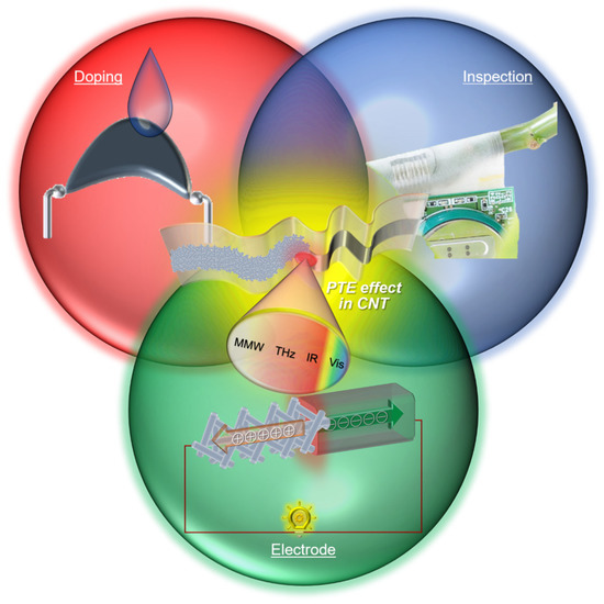 As the first step in designing PTE sensors, this chapter breaks down the fundamental properties of CNT films as the device material (Figure 2a–c). CNT films consist of randomly stacked CNTs and their network structures, resulting in high mechanical strength [27] and flexibility [28]. The CNT film also effectively absorbs ultrabroadband photo-irradiation at room temperature [29]. These features emphasize that employing a CNT film plays an essential role in developing ubiquitous non-destructive inspection devices and systems among other representative materials for PTE conversion, such as graphene [30], CNTs [31], MoS2 [32], SnSe [33], NbS3 [34], and PEDOT:PSS [35]. The CNT film collectively and advantageously satisfies the macroscopic free deformations and ultrabroadband photo-absorption among the above candidates. The CNT film further exhibits the Seebeck coefficients ranging from tens to hundreds of µV/K, which are comparable to those of PEDOT:PSS and so on. Based on these, utilizing the CNT film effectively converts external ultrabroadband photo-irradiation power to electrical signals for sensing or imaging measurements and simultaneously provides omni-directional viewing angles to 3D-structure targets.