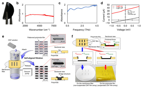 Fundamental properties of CNT films as the device material for the PTE sensors. (a) Photograph of a CNT film. (b) IR absorption characteristic of the CNT film. (c) THz absorption characteristic of the CNT film. (d) Current-voltage characteristics with and without light irradiation to the CNT film PTE sensor. (e) Diagram of the self-aligned CNT filtration process. (f) Examples of selective CNT film patterning. (a,d): Reproduced with permission from [24] Copyright 2021, the authors, published by Wiley-VCH. (b): Reproduced with permission from [26] Copyright 2022, the authors, published by American Association for the Advancement of Science. (c): Reproduced with permission from [25] Copyright 2021, the authors, published by Springer Nature. (e,f): Reproduced with permission from [36] Copyright 2021, the authors, published by Wiley-VCH.