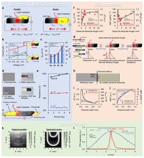 PTE effect in the CNT film channel–metal electrode boundary. (a) Operating mechanism. (b) Change in the device’s photo-current responses depends on the electrode structure. (c) Changes in the device’s effective Seebeck coefficients and PTE responses for different metal electrode materials. (d) Photographs of the device fabrication process. (e) Time course of changes in the device’s electrical resistances for different metal electrode lamination. (f) Changes in the device’s photo-detection sensitivities against the electrode length. (g) Schematic models for optimizing the device’s electrode length. (h) Schematic model for optimizing the device width. (i,j) Changes in the photo-detection sensitivities against the device width. (k) Comparison of the PTE images. (l) Comparison of the PTE response distributions across the device area. (a–l): Reproduced with permission from [24] Copyright 2021, the authors, published by Wiley-VCH.