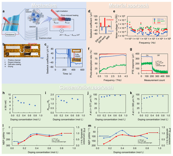 Based on the above considerations, Figure 4h–k shows the changes in each material property: thermal conductivity (Figure 4h), electrical resistance (Figure 4i), photo-absorption ratio (Figure 4j,k), and Seebeck coefficient [25] for the respective dopant concentrations. Therefore, Figure 4l,m maps the NEP value transition of the CNT-film-based photo-detector against the dopant concentration, which is in good agreement with the material-property-driven PTE conversion efficiency. The obtained behaviors indicate that the change in the thermal conductivity dominantly affects both the PTE conversion and photo-detection sensitivity. These assessments lead to proper selection of the dopant concentration (0.4 mol/L in this case) [25], and this process maximizes the photo-detection sensitivity of the CNT-film-based PTE sensor.