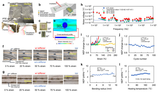 Mechanical and thermal durability and the associated optical stability of the CNT-film-based PTE sensor sheet. (a) Photograph and (b) schematic of the device. (c) Photograph of the rigid-soft patterning. (d) Photograph of the CNT film channel located above the partial stiffener. (e) FEM simulation of strain distribution on the device. (f) Comparisons of the device stretchability with and without the partial rigid stiffener with transferred CNT film channels and (g) printed CNT film channels. (h) Stability of the device thermal noise against strains. (i) Changes in NEP values of the device against multiaxial strains. (j) Stability of the device’s NEP values against the repetitive stretching. (k) Stability of the device’s NEP values in each bending radius during the sheet folding. (l) Thermal stability of the device’s NEP values. (a–j): Reproduced with permission from [26] Copyright 2022, the authors, published by American Association for the Advancement of Science. (k,l): Reproduced with permission from [24] Copyright 2021, the authors, published by Wiley-VCH.
