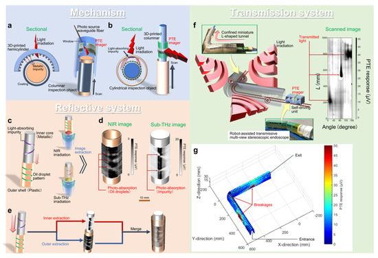 Demonstrations of active-style non-destructive inspections with the CNT-film-based PTE sensor sheet. (a) Operating mechanism of the monitoring modules in reflective and (b) transmission systems. (c) Simple diagram for the multi-wavelength reflective multi-view stereoscopic capsule PTE imaging. (d) Extracted reflective multi-view PTE images in NIR and sub-THz bands. (e) Simple reconstruction of the 3D multi-layered structure. (f) Simple diagram for the robot-assisted self-driving transmission multi-view stereoscopic PTE endoscopy. (g) 3D PTE image reconstruction of a defective L-shaped and confined miniature tunnel model. (a–g): Reproduced with permission from [25] Copyright 2021, the authors, published by Springer Nature.