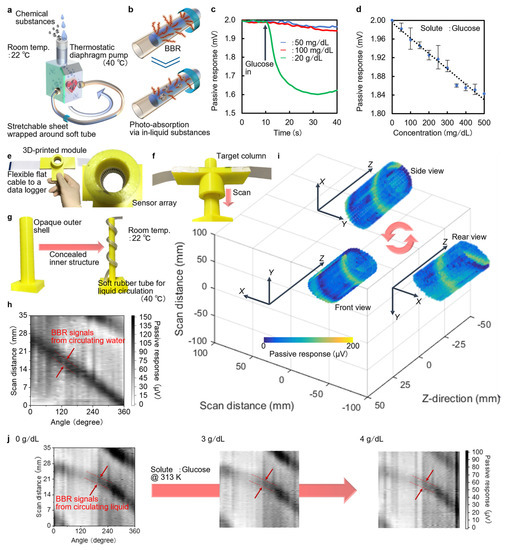 Based on these discussions, Figure 7a,b describes the operating mechanism of the BBR-based non-destructive on-site passive monitoring of in-liquid chemicals with the CNT-film-based PTE sensor sheet. The experimental system only requires wrapping the CNT-film-based PTE sensor sheet firmly around a soft liquid flowing or circulating tube (Figure 7a) [26]. Furthermore, the shape-conformable mechanical durability and associated optical stability of the sheet dynamically monitor the flowing targets in transformable tubes well by following the container deformations associated with inherent liquid fluidity. Therefore, the presented technique potentially provides anyone, not just experts, with opportunities to sustainably monitor in-liquid chemicals flowing in bellows hoses, medical rubber tubes, and plants in a target-friendly manner. The CNT-film-based PTE sensor sheet continuously detects the BBR of the solvent. Here, dissolution of the chemical substance induces reductions in the PTE responses of the device owing to local absorption of the solvent’s BBR with in-liquid chemicals (Figure 7b) [26]. This means that comparison of the reduction magnitudes of the device’s PTE response induced by BBR from the solvent before and after dissolving the chemicals leads to simple solution concentration monitoring (Figure 7c). For example, Figure 7d demonstrates the detectivity of the presented approach against a glucose solution, which currently ranges from 50 to 20,000 mg/dL [26]. The obtained performance potentially satisfies the sensitivity requirement for diverse chemical monitoring applications, including diabetes diagnosis [95] and plant or fruit sugar content measurements [96]. Meanwhile, developing a 360° around-view PTE imaging module (Figure 7e) captures and reconstructs the concealed liquid circulation in a non-destructive manner (Figure 7f–i: inspired by the previous section). By incorporating the above findings and techniques, the presented BBR-based non-destructive on-site passive monitoring of in-liquid chemicals omni-directionally and dynamically visualizes changes in the concentration of the glucose solution (Figure 7j) [26]. This system can handle arbitrary liquid-soluble chemical substances in principle. As the current demonstrations focus on single-component solutions, possible use cases include quality monitoring and impurity identification of manufacturing sites of beverages (e.g., sugar water), industrial chemicals (e.g., chlorine bleach), and medical practice fields (e.g., saline infusion).