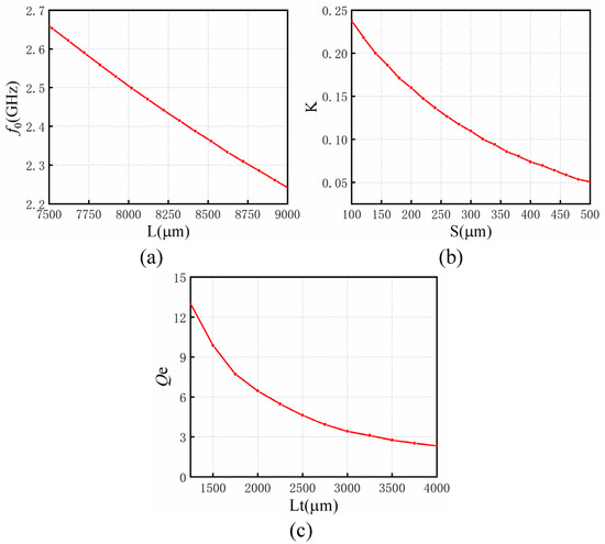 (a) Relationship between center frequency f0 and resonator length L. (b) Relationship between coupling coefficient K and distance S. (c) Relationship between external quality factor Qe and tapped position Lt.