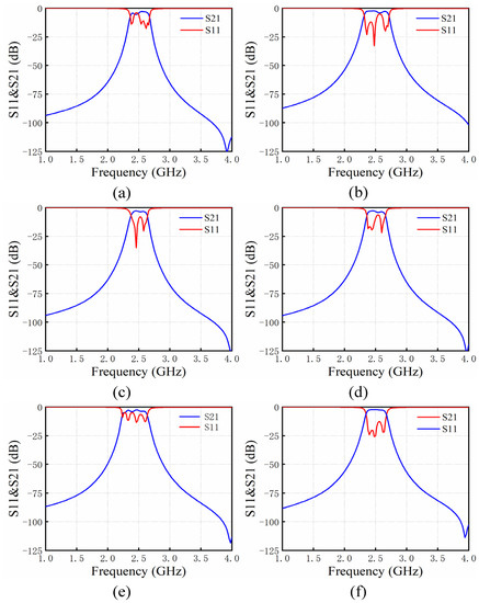 Then, the resonant frequency f0 and external quality factor Qe of the single resonator and the coupling coefficient K between two resonators of this filter are extracted by the 3D electromagnetic simulation software Ansoft HFFSS’s eigenmode solution model. The extraction of coupling coefficients K requires the creation of two single-cavity resonators placed side-by-side. At this point, the inherent resonant frequency f0 of the resonator is decomposed into two new frequencies f1 and f2 owing to the coupling effect. The coupling coefficient K can be solved by f1 and f2 as in Equation (9):