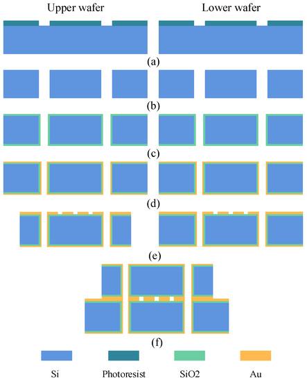 The above-mentioned interdigital filter can be fabricated by MEMS processing technology, which mainly includes bulk silicon, microsurface, and metallic bonding technology. Its substrate is a kind of high-resistivity silicon (>10 KΩ·cm) with a thickness of 400 µm. The main process steps involved are photolithography, ICP etching, coating, electroplating, corrosion, and bonding. The fabrication process is shown in Figure 7.