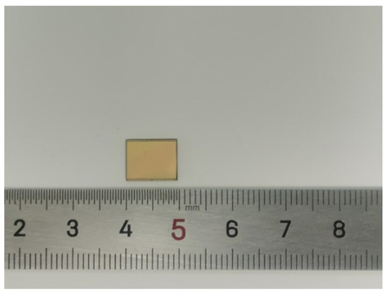 Firstly, a 10-micron thick photoresist was spin-coated on the silicon wafer surface and the pattern of the holes was transferred to the photoresist by photolithography. Secondly, holes were etched on the silicon wafer by the inductively coupled plasma (ICP) etching process. Thirdly, a 0.5-micron thick SiO2 isolation layer was then grown on the surface of the wafer and the sidewalls of the TSV by a high-temperature thermal oxygen process. Fourthly sputtered adhesion and seed layers of 50 nm Ti and 250 nm Au, respectively, on the wafer surface; then electroplate resonator and ground plane on wafer surface using photoresist as plating die and removing the seed layer and adhesion layer by wet etching. Finally, Au–Au thermal-compression bonding. The final size of the chip is 9.5 mm × 7.6 mm × 0.8 mm. The photograph of the fabricated filter is shown in Figure 8.