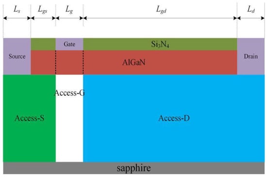Based on the reference [] and the actual manufacturing process, device cross section as shown in Figure 1 is used for computations in this paper. The materials from bottom to top are sapphire substrate, 1 μm GaN buffer layer, 20 nm AlGaN barrier layer with Al component of 0.3, and Si3N4 passivation material with 60 nm thickness, respectively. In addition, the gate width of the device is 50 μm. A background carrier concentration of 1 × 1015 cm−3 is added to the GaN buffer layer. The device has Ohmic contacts at the drain and source electrodes. The gate electrode is a Schottky contact; a barrier height of 1.6 eV is considered [].