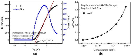 When the device is in the off-state, there are two general methods for determining breakdown voltage (Vbd): one is defined as the drain voltage corresponding to a drain current of 1 mA/mm []; the other is defined as the drain voltage corresponding to a sharp rise in the drain current [], which is also the way to determine the occurrence of breakdown in this paper. To ensure that the trap parameters in the buffer layer are consistent with the trap introduced by the actual doping, only the acceptor traps are added to the buffer layer. The trap energy level and capture cross section are Ec −0.5 eV and 1 × 10−15 cm−2, respectively [,]. As the GaN buffer layer doping process introduces the acceptor trap concentration in the range of 1015 cm−3 to 1018 cm−3 in the actual process [,], we define that the concentration of the acceptor traps varies from 1 × 1015 cm−3 to 1 × 1018 cm−3 in each region. The transfer and transconductance curves of the device are shown in Figure 2a. Transductance is the differential of the drain current (Id) to the gate voltage (Vg), reflecting the ability of the gate electrode to control the drain current. The threshold voltage obtained from the transfer curve is −2.465 V and the maximum transconductance is 334.3 mS/mm, which meet the simulation requirements for depletion-mode devices [,]. The variation of threshold voltage with acceptor trap concentrations is shown in Figure 2b; it can be seen that the threshold voltage increases with the increase of trap concentration, which is consistent with others’ research [,,]. Therefore, the structure can be used as the simulation of breakdown performance.