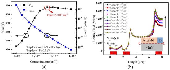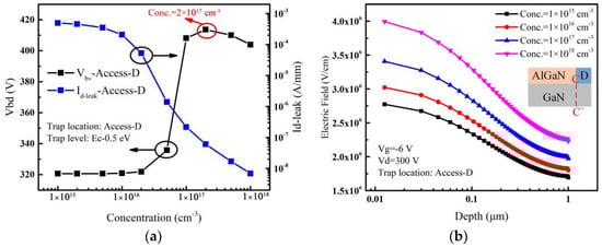 When the acceptor traps are only introduced in the Access-D region, the variation of leakage current and breakdown voltage with the acceptor trap concentration are shown in Figure 5a. The breakdown voltage reaches a maximum value by increasing the concentration of traps up to 2 × 1017 cm−3 and then decreases. The leakage current decreases by about 5 orders of magnitude. For different acceptor trap concentrations, electric fields extracted along the vertical line (C-C’) near the drain edge with a high drain voltage are shown in Figure 5b. It shows that the electric field near the drain increases continuously with the increase of the acceptor trap concentration. As a result, when the trap concentration is lower (before 2 × 1016 cm−3), a slight decrease in leakage current occurs, resulting in a little change in breakdown voltage. As the trap concentration continues to increase, the leakage current decreases rapidly, causing a rapid increase in the breakdown voltage. Also, because of the higher acceptor trap concentration, a higher additional electric field is introduced near the drain edge []. As the acceptor traps in the Access-D region are closer to the drain electrode, the additional electric field formed by ionized traps has a more obvious effect on the electric field peak near the drain. As discussed above, the breakdown voltage starts to drop after saturation as shown in Figure 5a.