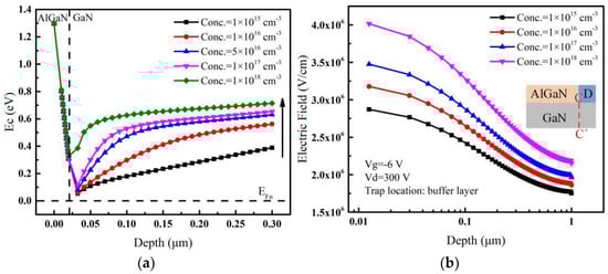 From Equations (2) and (3), it can be seen that when the acceptor trap energy is fixed (i.e., Etrap is fixed), the electrons’ capture rate increases with the increase of acceptor trap concentration p and parameter ηn, and the parameter ηn is proportional to the difference between the conduction band energy (Ec) and the Fermi energy (EFn). Figure 4a shows the conduction band energy of the device at different trap concentrations; it can be seen that the Fermi energy (EFn) is closer to the conduction band (Ec) when the acceptor trap concentration is lower. That is, ηn is smaller when the trap concentration is lower. In other words, the number of electrons captured by acceptor traps will increase with the high trap concentration, which in turn leads to a decrease in the leakage current in the buffer layer. With the decrease of the leakage current, the resistivity of the buffer layer gradually increases, thus delaying its avalanche breakdown [,]. Therefore, the breakdown voltage continues to increase until the trap concentration reaches 5 × 1016 cm−3.