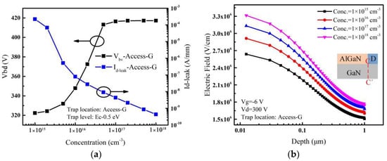 When the acceptor traps are only introduced in the Access-G region, the variation of leakage current and breakdown voltage with the acceptor trap concentration are shown in Figure 6a. It can be seen that the breakdown voltage increases first and then gradually saturates as the trap concentration in the Access-G region increases. The leakage current decreases by about 6 orders of magnitude. When the trap concentration is lower, the leakage current decreases rapidly with the acceptor trap concentration increasing, leading to a rapid increase in the breakdown voltage. For different acceptor trap concentrations, electric fields extracted along the vertical line (C-C’) near the drain edge with a high drain voltage are shown in Figure 6b. It can be seen that with the change of the acceptor trap concentration in the Access-G region, the electric field varies less than that with introducing acceptor traps in the Access-D region. This behavior can be explained as follows.