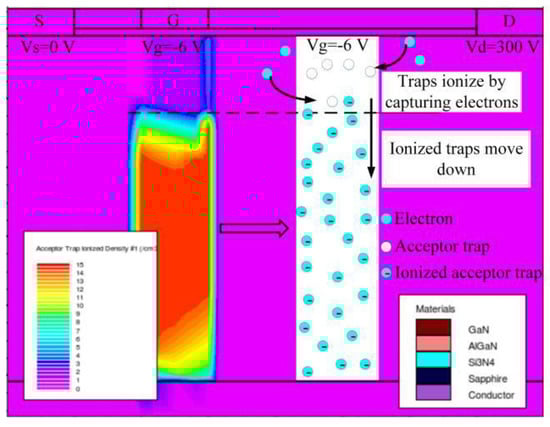The distribution of the ionized acceptor traps in the Access-G region is simulated and shown in Figure 7. Ionized traps move down because of the repelling effect of negative gate voltage []. Therefore, compared with traps in the Access-D region, the ionized traps in the Access-G region are mainly distributed in the region below the gate and further away from the drain. This results in a relatively small increase of the additional electric field near the drain. Under the combined effect of the decreasing leakage current and the smaller increasing additional electric field near the drain, the breakdown voltage saturates at last (see Figure 6a).