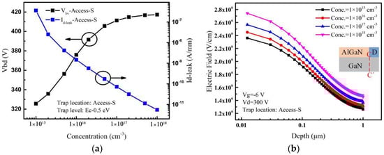 When the acceptor traps are only introduced in the Access-S region, the variation of leakage current and breakdown voltage with the acceptor trap concentration are shown in Figure 8a. The breakdown voltage increases rapidly and then slowly with the increase of the acceptor trap concentration in the Access-S region. The leakage current decreases by about 6 orders of magnitude. With the increase of trap concentration in the Access-S region, the leakage current decreases and the breakdown voltage increases. Meanwhile, ionized traps create an additional electric field in the GaN layer. The electric fields extracted along the lateral line (C-C’) near the drain edge are shown in Figure 8b. The result shows that the electric field near the drain edge varies less with trap concentration compared with that in the Access-D and Access-G regions. This means that the additional electric field generated by the ionized traps has the smallest effect on the electric field peak near the drain edge, as the traps in the Access-S region are farthest from the drain electrode. Therefore, with the smallest effect of the additional electric field, the breakdown voltage still increases slowly instead of dropping or saturation at the larger trap concentrations as shown in Figure 8a.