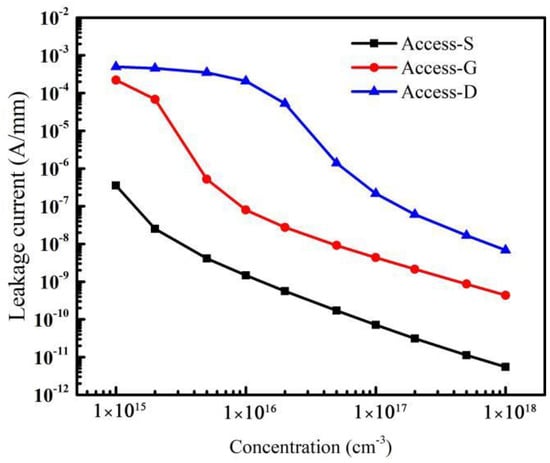 In addition, the variation of the leakage current is directly related to the breakdown voltage of the device []. The acceptor traps in the Access-S region can obtain a more uniform variation of the leakage current, and the decreasing trend of the leakage current is almost linear (see Figure 9). Thus, the breakdown voltage rises more gently and evenly with doping in the Access-S region. Moreover, because the acceptor traps in the Access-S region are farthest away from the drain, the additional electric field caused by ionized traps has the smallest effect on the electric field peak near the drain. All factors above make the breakdown voltage increase more controllably. Therefore, it is a potential approach to control breakdown voltage by doping in the Access-S region during the fabrication process, though more research and practice are needed before its practical application.