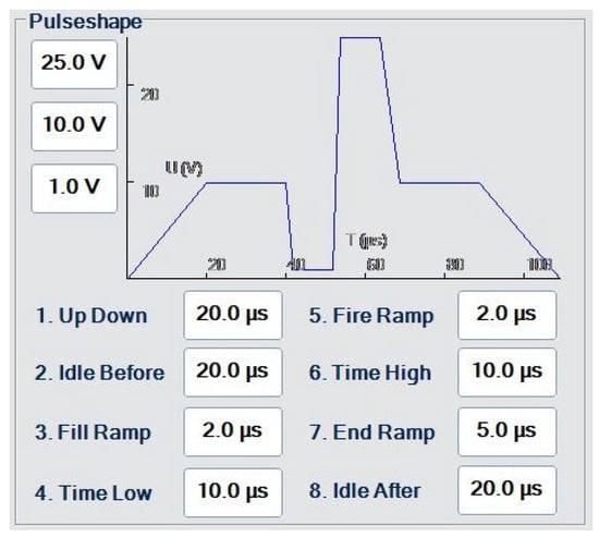 Under the influence of surface tension, a jet of fluid finally disintegrates into droplets as per the natural tendency of fluids to attain a low-energy state [24]. However, in case of inkjet fluids, this phenomenon, evolving into Rayleigh–Plateau instability aids the droplet formation, by introducing an unstable form of equilibrium in the jets of fluid produced by capillary forces [25]. For droplet production in DoD printers, fluid (jet) columns need to be perturbed at deliberate points to terminate them at desired lengths and these perturbations can be induced by introducing peaks in the printing voltage waveform. The waveform designed for the PiXDRO (Süss Microtec SE, Garching, Germany) inkjet printer used in this work is shown in Figure 1. Since the actuators at the nozzle are piezo-electric in nature, the application of a pressure differential for drop production equates to the application of a voltage differential. Commercial printers supply this differential by applying a negative voltage followed by a positive voltage. However, in this work (due to hardware limitations) this differential is supplied by initially ramping the baseline voltage to 10 V and then lowering the voltage to 0 V, which would be the equivalent of a negative voltage in commercial printers.