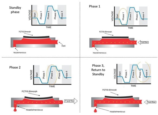 Figure 2 shows different stages at the printhead and nozzle of a commercial printer and how each part of the waveform affects the way ink exits the nozzle. This waveform is slightly different from the one used in this work, shown in Figure 1, mainly due to the negative voltage applied in Phase 1, Figure 2, while in Figure 1, the voltage is ramped up and then brought down to compensate for the negative voltage, as mentioned earlier.