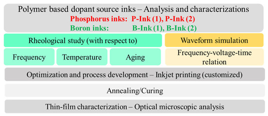 Figure 3 tabulates the experimental procedure followed in this work. Inks (obtained from commercial manufacturers) were characterized using a TriPAV rheometer (TriJet Ltd., Cambridge, UK) and a Picoscope (Pico Technology, Cambridgeshire, UK). The TriPAV rheometer allows analysis of the rheological behaviour of inks, in terms of their viscosity and elasticity, at high frequencies (up to 10 kHz), which is not possible with conventional rotational rheometers (which provide data in the 10–50 Hz [13] range only). In this work, four inks were analysed, two phosphorus- and two boron-based. Among the two P-inks used, difference lies in their polymer and dopant concentration, polymer chain lengths, concentration of organic additives, solvents, etc. Similar differences lie between the two boron inks. P and B dopant source inks have been categorized into ‘concentrated/dilute’ based on conventional arguments of base polymer concentration being ≥5% [33], and the polymer concentration in all used inks being above 20% at least, as indicated in Table 1 [34,35,36,37]. P- and B-inks (1) and P- and B-inks (2) were commercially purchased from Desert Silicon and Filmtronics, respectively.