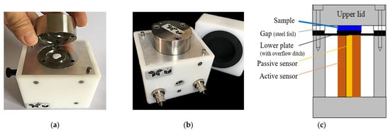 Schematics of the PAV rheometer: (a) sample (white coloured) placed on lower plate, (b) hermetically sealed plates, to be covered with the insulating top (present besides the device), (c) transverse section showing each part of the assembly inside the PAV rheometer [38].