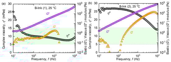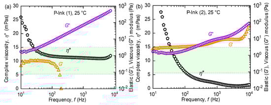 The flow curves of the P-inks, at room temperature, give an insight into the nature of the ink, varying with the frequency sweep, as shown in Figure 5. As per the manufacturer’s recommended inkjet printhead viscosity [22] range (highlighted in green in Figure 5) for P-ink (1) was observed in the entire frequency range, as in Figure 5a, but for P-ink (2) desirable values were limited in the frequency range fmin ≥ 200 Hz to fmax ≤ 1 kHz (Figure 5b). The favourable range of properties is specific to the printhead type thus allowing only limited fluids to flow smoothly. P-ink (1) exhibited near ideal behaviour, both qualitatively while printing and quantitatively in terms of the magnitude of η* as well as G′ and G″.