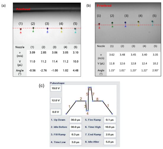 Dynamic analysis of (a) P-ink (1) and (b) P-ink (2) droplets captured by drop-watcher of the PiXDRO LP50 printer. The volume V, velocity v, and angle of the flying droplets quantify the printing behaviour. As shown here, controlling these parameters enables achievement of the precise printing of droplets onto the substrate. (c) The waveform used to obtain the droplets in (a,b).