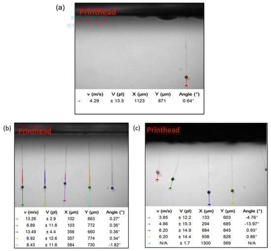 (a) Dynamic analysis of B-ink (1) droplets by drop-watcher of the PiXDRO LP50 printer showing clogged nozzles produced by using the waveform shown in Figure 7 (c). (b) Long tails of large droplets produced due to an increased printhead temperature of 40 °C and (c) diverging droplets with random flight directions producing unwanted printed structures using an increased voltage of 60 V.