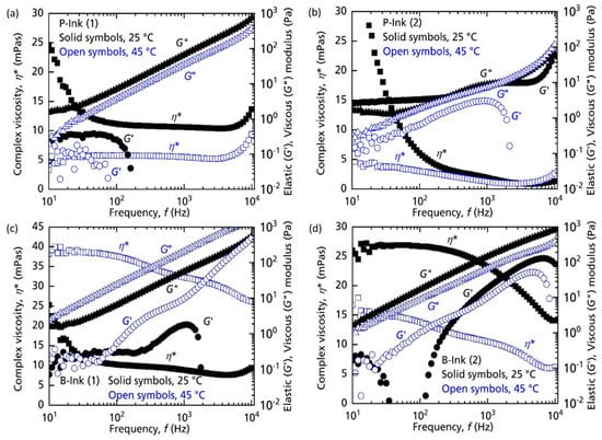 Evolution of the rheological flow curves with a rise in temperature. Complex viscosity (η*), elastic (G′) and viscous (G″) modulus measurements of (a) P-ink (1), (b) P-ink (2), (c) B-ink (1) and (d) B-ink (2), with respect to frequency (f) at 25 °C and 45 °C as measured by the PAV rheometer.