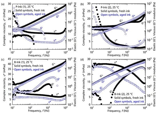 The printing behaviour of the B-inks was contrary to that of the P-inks. Comparing the rheological characteristics of B-ink (1)-Figure 8a, with P-ink (1)-Figure 5a, at 25 °C they appear very similar. η* shows a small negative slope; however, within the inkjet printing frequency range, the values are within the supplier recommended region.