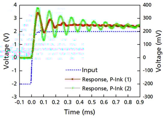 Waveform simulation (voltage vs. time) obtained from the Picoscope at 25 °C for P-ink (1), and P-ink (2).