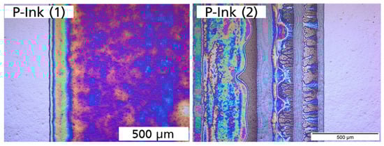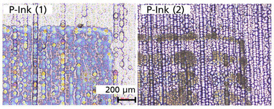Optical microscope images captured at a resolution of 500 µm, after high-temperature annealing in a tube furnace, for P-ink (1) and P-ink (2), printed on a shiny-etched surface of the FZ-Si wafer at a printing resolution of 600 × 600 dpi [16].