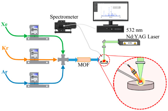 −1. Each line was attached to compressed cylinders with pure source gasses (AirGas, Oak Ridge, TN, USA, 99.99%). Following the junction after the mass flow meters, the gas line was plumbed into a laser enclosure for LIBS measurements. The gas line was delivered to the sampling point using a pipette tip as a nozzle aimed toward the surface of an aluminum substrate. A 532 nm Nd:YAG laser (Lumibird, Bozeman, MT, USA, Ultra) was fired and focused onto the aluminum substrate. The substrate was used to ensure breakdown occurred at a repeatable position as air breakdown did not occur with the 532 nm laser and energy ranges used. The height of the aluminum substrate was aligned with the laser focal point using a Keyence laser to measure distance. The plasma light was collected at ~45° from the laser pulse and was routed to the spectrometer using a 2 m fiber-optic cable (Avantes, Lafayette, CO, USA, FC-UV200). An echelle-type spectrometer (Catalina Scientific, Tucson, AZ, USA, EMU-120/65) was used along with an electron multiplying charged-coupled device (Raptor Photonics, Falcon Blue) and a pulse generator for external triggering (Quantum Composers, Model 9214). The spectrometer was wavelength calibrated using a Hg:Ar lamp (StellarNet Inc., Tampa, FL, USA, SL2). A diagram of the planned experimental setup is shown in