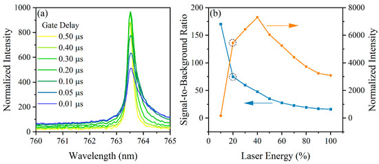 LIBS measurements are subject to the acquisition settings used when forming the plasma and observing it. These settings include spectrometer delay and exposure time, laser energy, and the number of shots used. These parameters were optimized by investigating the signal response to changes through tracking the signal-to-background ratio (SBR) [