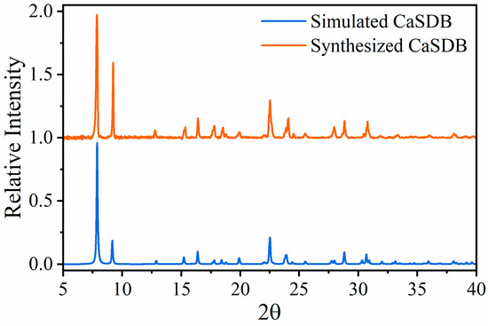 XRD measurements were used to analyze the phase composition and structure of CaSDB powder and the CaSDB engineered particles. The sample was placed in a powder sample holder under ambient conditions, and an XRD pattern was collected continuously using CuKα1 radiation (λ = 1.54056, 2 θ range from 5° to 40°). The bulk sample XRD signal was found to be identical to the simulated XRD signal, suggesting the phase purity of the CaSDB. The XRD measurement of the synthesized CaSDB compared to the simulated pattern is shown in