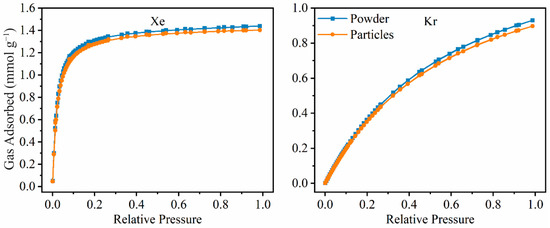 −1. However, the engineered particles have a slightly lower Xe and Kr adsorption capacity at all the pressure points (