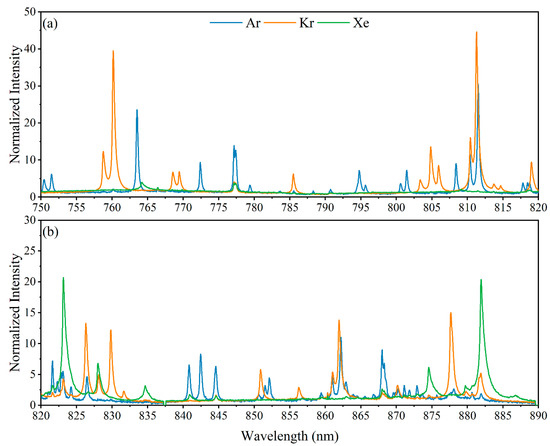 Figure 5 in the near infrared range from 750 to 890 nm, where the gas emissions dominate the spectra. Over the 140 nm wavelength range shown are several unique peaks for Ar and Kr. Xenon, however, has far fewer strong emissions, and several of them are convoluted with other species’ emissions. Fortunately, the four strongest Xe emission peaks at 823.15, 834.67, 875.56, and 881.95 nm have little interference or have a far larger relative intensity than their interferent peaks. A handful of other emission peaks of relevant species are seen outside the spectral range plotted in