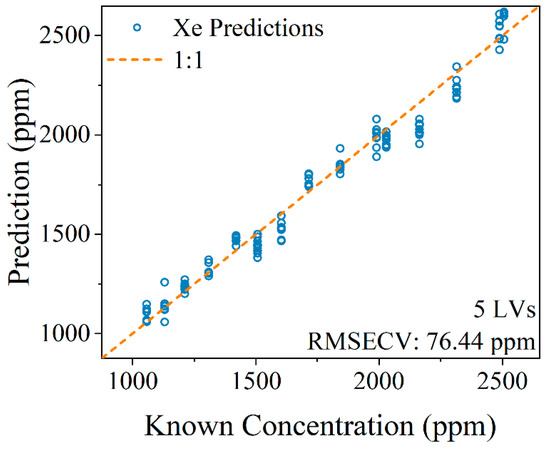 Figure 5 (750–890 nm) using 4500 spectra of gas mixtures ranging from 1000 to 2500 ppm Xe. The spectra were normalized to the maximum intensity of each spectrum (Ar I 763.5 nm), and then every 20 spectra were averaged. The dataset was split 50:50 into training and test datasets. The PLSR model showed strong prediction performance on the test set with a root mean squared error of cross validation of 76.44 ppm. These predictions are illustrated in the parity plot shown in
