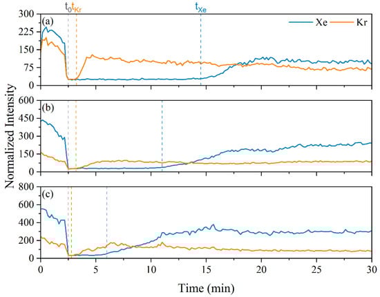 Figure 7, the Xe breakthrough time was reduced as the Xe concentration in the gas stream increased. Intuitively, the Xe peak intensities increased from test to test as the Xe gas concentration was increased. Similarly, the Kr breakthrough times, and peak intensities were consistent across the tests as Kr concentration was held constant. The Xe breakthrough times were 12, 8.5, and 3.5 min. The Kr breakthrough times were 0.75, 0.70, and 0.30 min. These breakthrough times can be used with the gas compositions to determine the Xe and Kr loading on the MOF and then the MOF selectivity can be calculated using Equation (2):