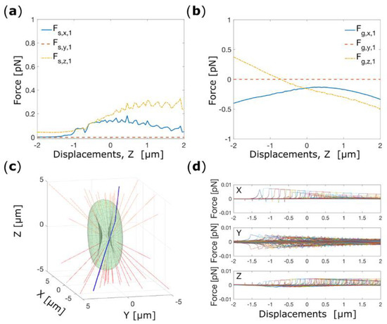 Figure 2. (a) Cartesian component of the scattering force as a function of the translation along the z-axis. (b) Cartesian components of the gradient force acting on the center of mass of the RBC as a function of the cell’s displacements along the z-axis. (c) Ray traces for a cell placed in the folded position and located at (xeq,1, yeq,1, zeq1). The blue ray indicates the light ray that exerts the highest force on the cell. (d) Total optical force exerted by each single light ray on the center of mass of the cell.