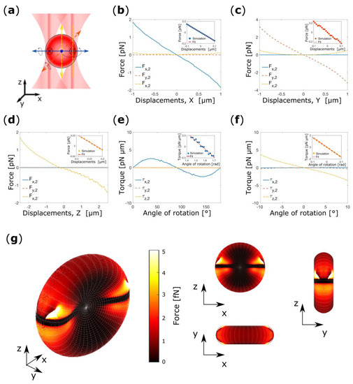 Figure 4. (a) Schematic depiction of double-beams optical tweezers. The colored arrows indicate the possible translation of the cell, while the black arrows highlight the possible rotation around the axes represented by the dashed line. (bf) Optical forces and torques acting on healthy RBC for a dual-beams optical tweezers. Cartesian components of the total optical force acting on the center of mass of the RBC as a function of the cell’s displacements in respect to the center of the optical trap for displacements along x (b), y (c) and z (d), and Cartesian component of the optical torques for cell rotation around x (e), and z (f). The inserts show the linear fit to the approximately linear portion of the force-displacements and torque-rotation curve. In (g) are reported the distribution of optical forces generated by the two-beam trap on the surface of the RBC. Note, that the reported forces are solely the normal force at each point.