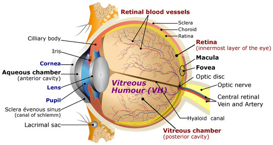 Ophthalmology is the branch of medicine that is concerned with the eye and its diseases. There exist a number of textbooks with in-depth analyses of the eye, such as the work by Snell and Lemp [19]. Similarly, there are numerous conditions of the eye that all require their specific forms of treatments. In particular, the discipline of vitreoretinal surgery includes basically all operations related to the vitreous and to the delicate retina (see also Figure 1), whose health is essential for good vision. Such ophthalmic procedures have great potential to be performed, involving less invasiveness through medical intraocular magnetic microrobots. Retinal surgery requires extremely precise movements and small tool–tissue interaction forces. Otherwise, there is a potential risk of permanent damage (i.e., permanent vision loss) through even small surgical error. For instance, one particularly difficult procedure is the retinal vein cannulation to alleviate its occlusion. Such retinal occlusion is one of the most common causes of vision loss in patients. Its prevalence is 1.6% for adults aged 49 years or older [20]. Various treatment methods for this pathology have been proposed. For instance, intravitreal thrombolysis (thrombolysis, also called fibrinolytic therapy, is the breakdown of blood clots formed in blood vessels) with tissue plasminogen activator injection is the most promising treatment [21]. To do so, thrombolytic enzymes (i.e., clot busting) have to be injected into the tiny occluded vein (diameter of about 100 ).