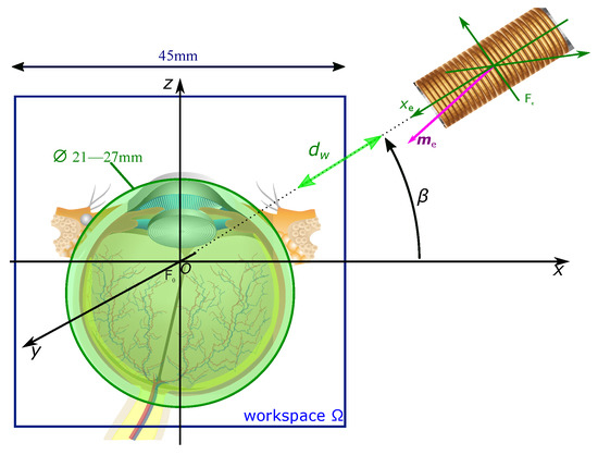 First, the geometric constraints of the eyeball and the head should be considered. As reported by Bekerman et al. [27], the size of a human adult eye is about to ; there is not a significant difference among genders or age groups. Hence, the diameter of the considered workspace should be at least . However, some extra spaces should be reserved for other eye tissues and the movement of eyeballs. Similarly, the workspace should be defined with respect to the working distance between the workspace center O and the electromagnet, as reported in Figure 3. From the analysis carried in [2], should be sufficiently small to enable strong magnetic field in . Based on these results and requirements, the workspace is defined as a cube of volume of with a working distance .