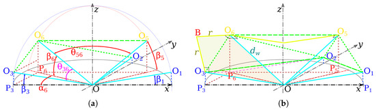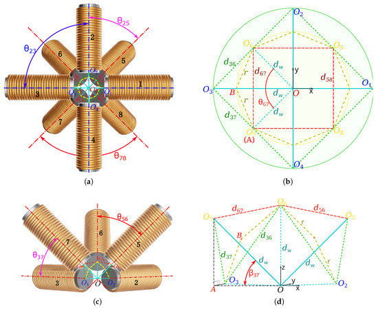 Figure 6 represents the geometric view of the electromagnetic coils, where the cyan lines denote the distance from the tip center of the electromagnet e to the workspace center O; the yellow lines represent its external radius r; and the green lines indicate the distances between the core center and the adjacent contacting electromagnets. First, due to the axisymetric arrangement, the distances between two neighboring stationary coils and are identical; in the same way, all distances between two adjacent moving coils and are equal. Next, each electromagnet has a cylindrical face of radius r. It can be shown that r is tangent to the sphere of radius , and they are on a same plane for the two contacting coils, and then and r intersect at right angles (90°), as represented in Figure 6b,c and Figure 7. As all coils share the same radius r and working distance , for stationary coils and their adjacent mobile coils , the distances all have the same length. (: possible cases are , , , , , , and ). Thus, a mobile coil and its two adjacent stationary coils and form an isosceles triangle , and in the same way also form an isosceles triangle. Following the same reasoning, it can be seen that all angles between two adjacent mobile coils and are identical (: possible cases are , , and ); and similarly, every angle between a mobile coil j and a neighboring stationary coil i has the same value. (: possible cases are , , , , , , and ).