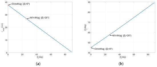 Figure 8 shows the evolution of the admissible radius and of mobile angle when the contact constraints are satisfied. For instance, when the OctoMag configuration is considered [4], for the stationary coil set leads to for the moving coil set (or the upper set equivalently). Obviously, can be computed from the above equations that provides the maximum coil dimensions. Thus, when the is set to 65 mm, the radius of can be derived.